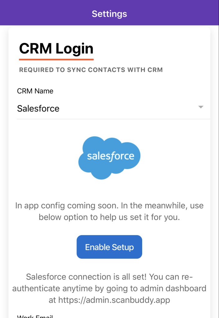The integration also allows contact owner to share contacts from Salesforce instance to be available on ScanBuddy.ai app for entire sales team. Sales teams can enable the integration right from the ScanBuddy.ai mobile app by selecting Salesforce CRM in the settings tab and enter essential details.